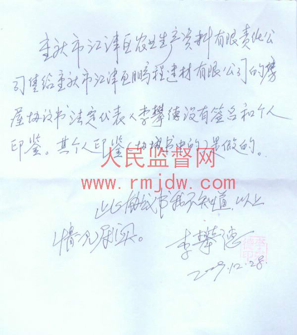 江津区供销社下属的农资公司在举报信中称,2009年11月25日,人民监督网对江津区供销社下属的江津区物资回收公司报道后,杨正奎仍不思悔改、顶风作案,于2009年11月26日,将江津区农资公司所属的江津区几江镇滨江路8幢7号底层门面、德感镇上新街79号第一层至七层非住宅,白沙镇朝天嘴居中兴路205号的房地产,上新街的仓储用地,非住宅用房建筑面积共计6466。6平方米,仓储用地建筑面积1200平方米。卖给江津区程鹏建材有限公司,此买卖协议上农资公司的法人李攀德个人印章是假的。2009年12月28日,李攀德证实此印章不是他所盖。