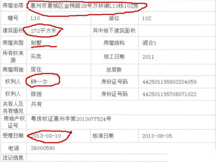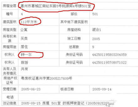 惠州市“万林湖”豪华别墅一栋,产权人为钟一尔,面积272平方米,价值363万元;另外该别墅区的三期10栋某房,专供钟一尔的儿子儿媳使用;