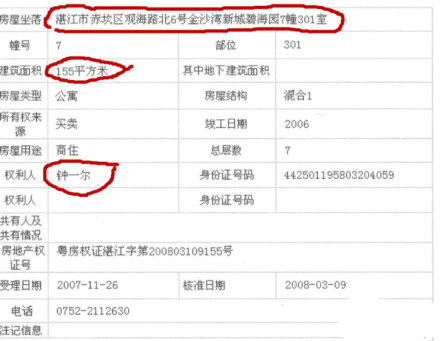 4.湛江市赤坎区观海路北6号金沙湾新城碧海园7栋301房,洋房式产权房,产权人为钟一尔,房产证号为:粤房权证湛江字第200803109155号,面积155平方米,价值1250000元。