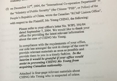 程慕阳的诉状指,2001年到2004年,中国警方与加拿大警方在北京联络办公室讨论他的案件。诉状引述了一封2004年12月22日中国公安部国际合作部门,向加拿大皇家骑警联络办公室发出的信件。