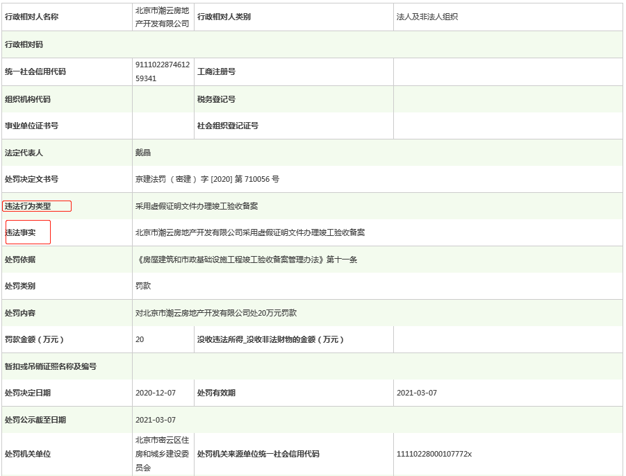 中国经济网北京1月28日讯 (记者 张海蛟) 近日,北京市密云区住房和城乡建设委员会对北京市潮云房地产开发有限公司(以下简称:“北京潮云地产”)罚款20万元,其存在采用虚假证明文件办理竣工验收备案的违法事实。行政处罚决定书文号:京建法罚(密建)字[2020]第710056号。记者查询发现,北京潮云地产为翰德集团有限公司(以下简称:“翰德集团”)旗下全资子公司。