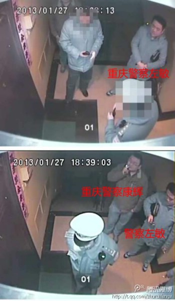 2013年1月27日18点27分,朱瑞峰位于北京市西城区德外派出所辖区内住宅门口先后来了5个人,声称是警察,要向他了解有关情况,没具体说明要了解什么情况,其中两人是重庆口音。因为无法核实来人身份,晚上开门存在很大危险,当天又是法定假日(周日)需要休息,朱瑞峰要求他们立即撤离,说如需了解情况请到德外派出所谈。这些人拒不撤离,仍不断敲击朱瑞峰家防盗门、按门铃,多次大声喊话。朱瑞峰感到非常紧张和恐惧,以为重庆警察要来抓自己抢夺手中部分重庆官员不雅照录像。无奈,朱瑞峰将此事紧急发布在新浪等4大门户网站的微博,向广大网友和各大媒体同仁、著名学者求救。在网络舆论的强烈谴责下,来人要求朱瑞峰必须第二天到北京市德外派出所谈话,才于22时53分撤离。朱瑞峰家门外的录像资料显示,警察在朱瑞峰家门外共3小时28分钟。