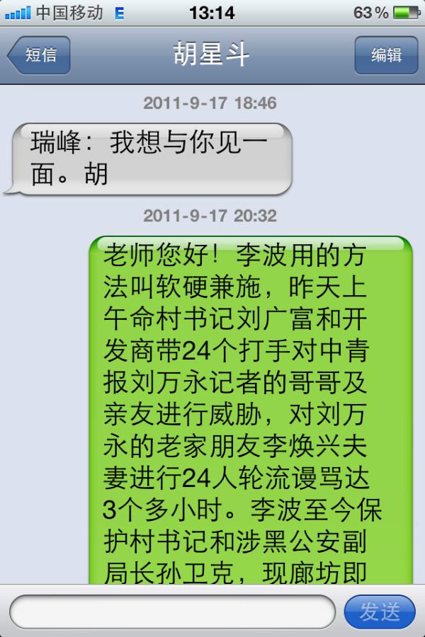 三、2011年9月16日18点23分,胡星斗教授发来手机短信:瑞峰:我的多年好友、原《瞭望》副主编、现北大一个研究院副院长刘东昌教授的亲戚正是那个廊坊秘书长,刘多次找我求情,希望能删除你网站上的帖子。刘与张祖桦、茅于轼都熟,属于我们圈子里的朋友。廊坊方面表示当初性急说了不该说的话,他们绝不会抓捕你的。我认为冤家宜解不宜结,他们既然认错了,你也就得胜收兵吧。也是给我一个面子,我好向朋友交代了。你悄悄撤掉帖子吧,不要声张,给对方一点面子,以上内容都不要上网。下次我们与刘教授见一面,他在北外也兼职带硕士研究生,他跟圈内的民主朋友都很熟。谢谢你,胡
