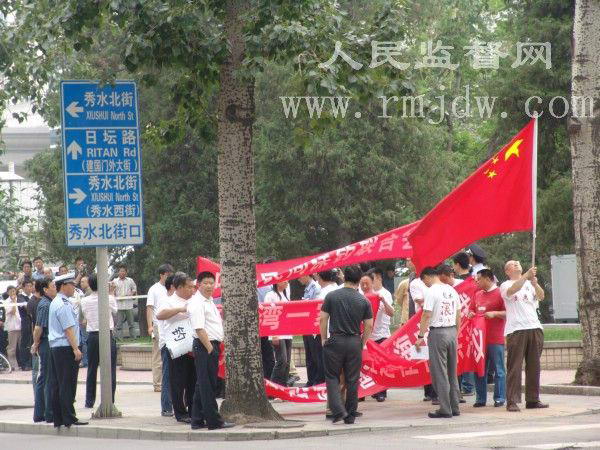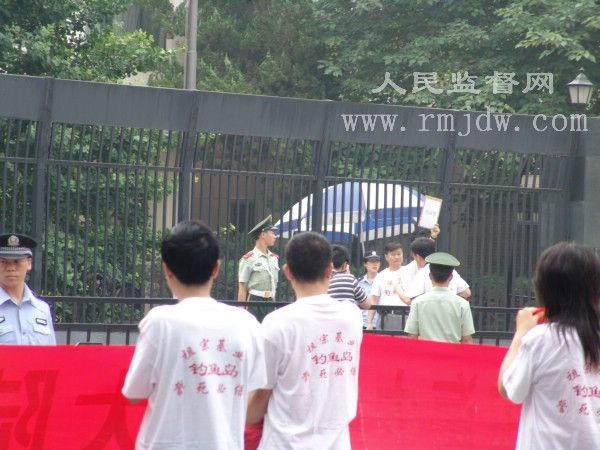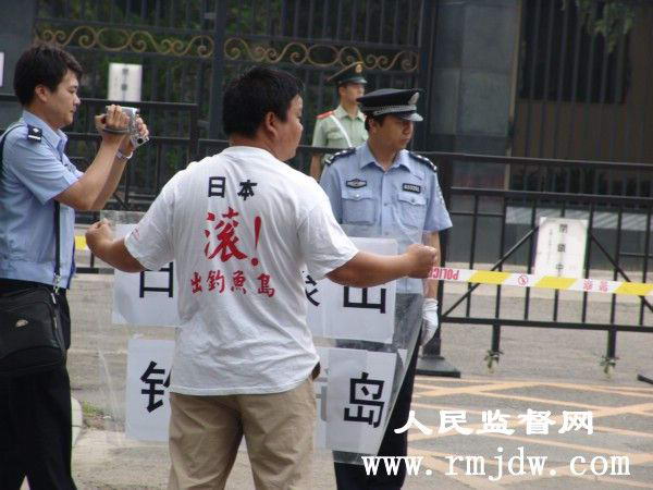《人民监督网》记者看到,一位日本使馆官员在大门铁栅栏里面向外窥望,并用笔在本子上记录者。示威领队用喇叭对记者采访区说:“世界各国的记者朋友们记住了,日本人的德行,OK,我们给他们送过去”。最后由示威代表张立昆先生将“抗议信”投至日本使馆信箱。