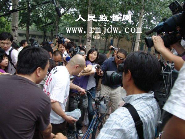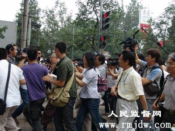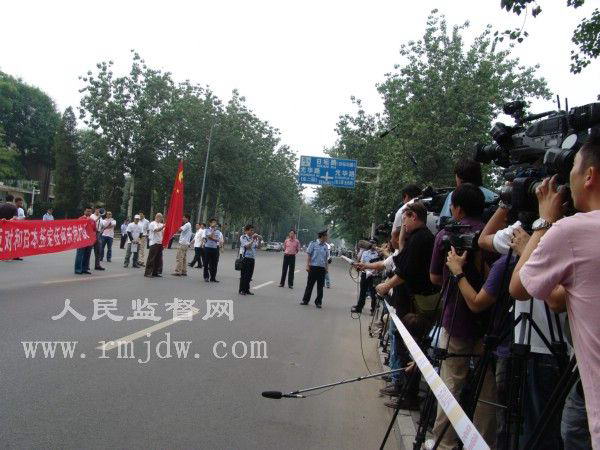 下午1点多钟,各国记者早早的来到日本国驻华使馆前。至2点十分,聚集在日本国驻华使馆前的各国记者达上百名,为保证使馆区的秩序,北京警方将前来采访的新闻记者们的证件验证登记,并划定了新闻记者采访区。