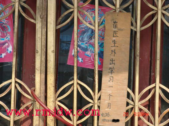 记者重返香菇市场看到,一楼的崔氏诊所大门紧闭,诊所门上一个小牌子上写着,崔医生外出学习一个月,并留有手机号。