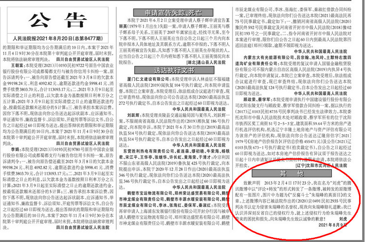 本公告见2021年08月20日 人民法院报二版 http://rmfyb.chinacourt.org/paper/html/2021-08/20/node_3.htm
