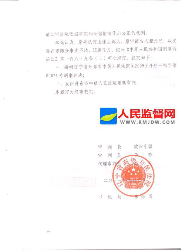 2011年5月6日,辽宁省高级人民法院下达(2010)辽刑四终字第27号刑事裁定书。撤销丹东市中级人民法院(2009)丹刑一初字第00074号一审刑事判决书,发回丹东市中级人民法院重新审理。