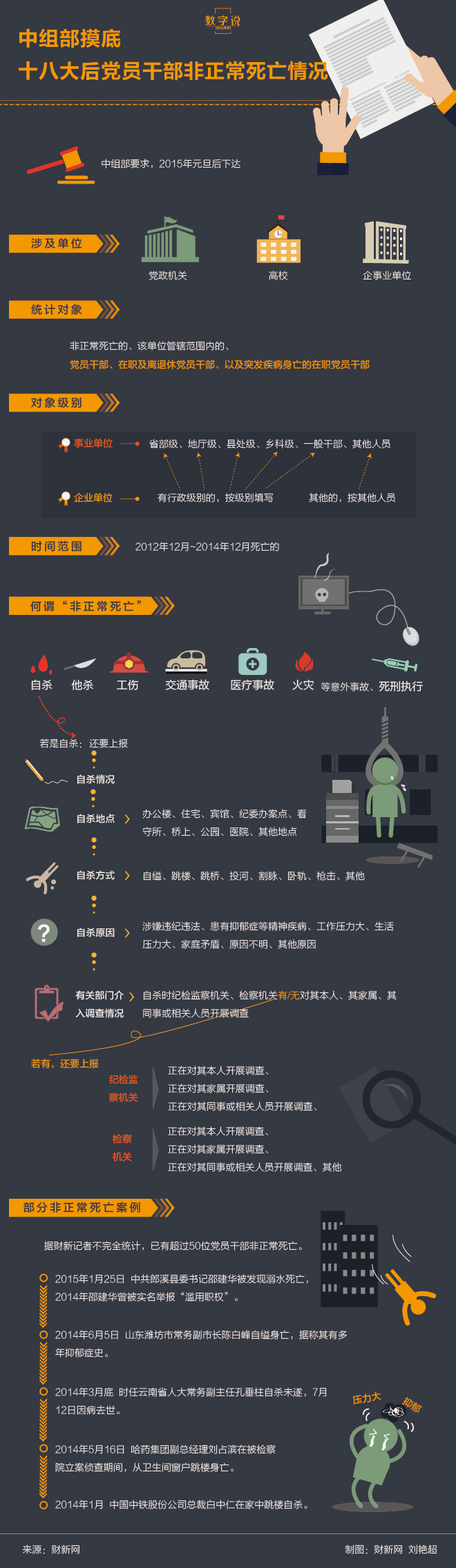 2015年3月最后一天,无锡市委副书记蒋洪亮以跳塔的方式结束了自己的生命。中组部曾于2015年元旦过后,下达关于“十八大以来党员干部非正常死亡情况统计表”的通知。通知要求上报非正常死亡党员干部的基本情况以及死亡时间、死亡原因。尤其是自杀的,通知中对自杀情况、自杀地点、自杀方式、自杀原因、有关部门介入调查情况等都有详尽的要求。据财新网统计,党员干部近年自杀身亡以跳楼、自缢居多,而抑郁症又成为其中最常见的自杀原因。