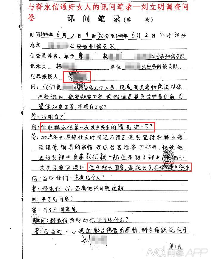 刘某在笔录中被问及“和释永信第一次发生关系的情况”。刘某回答,约为2000年中,她到登封和释永信谈佛像模具。谈完后她准备回郑州,释永信说正好有事就一同去了。