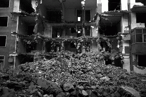 | 一位居民拿着水桶和洗好的衣服经过一处被损毁的居民楼。该楼的正中间从一楼到四楼被铲车挖了个大洞,而在楼的顶层仍然住着一家四口。 |