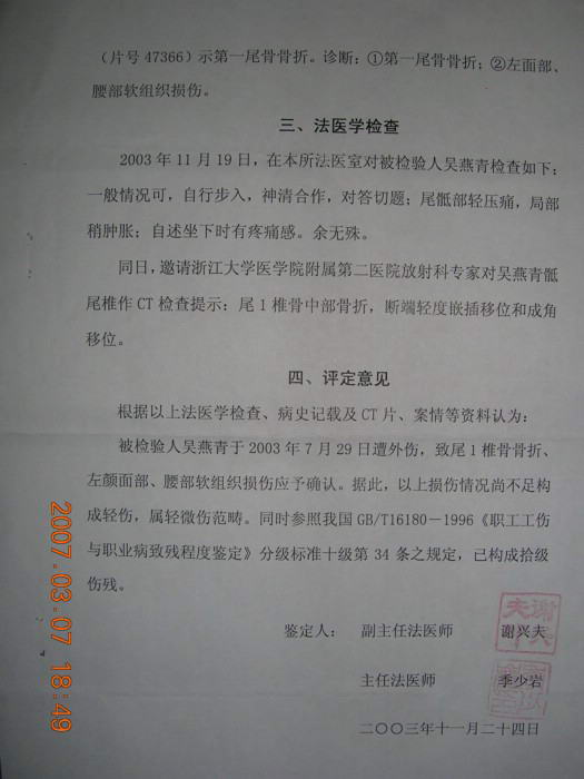 吴燕青说,自己被法官带到浙江省淳安县人民法院执行庭的一个办公室里,坐下不到二分钟,见一个人(后来经证实叫姚春妹,女,淳安县人民法院执行三科科长。)来到身边,不问青红皂白地用一个什么东西打她的头部,接着又抓住她的头发,把头按下去打,吴燕青顺手拉住她的衣角,拼命地抬起头来,看到有四、五个人在打自己,吴燕青出于本能,发现边上有一把开水瓶,就抓起来阻挡他们的拳头(抓起来后感到开水瓶里面几乎是空的,只是残留了一点水),法院执行人员边打边夺开水瓶,在争夺中开水瓶被他们夺过去时塞子掉出来,溅出几滴水到他们身上,这时法院执行人员暴跳如雷,恼羞成怒、变本加厉,几个人把吴燕青按在椅子上,姚春妹发疯似的要撕吴燕青的衣服,并大声说:“反正是街上卖的,让你们看看”,虽然吴燕青拼命挣扎,但衣服还是被撕开了。执行人员接着又把吴燕青推倒在地上拳打脚踢。吴燕青拼命喊“救命,救命”,但是这种呼救声是那么的微弱,结果被他们打得躺在地上起不来,脸上又青又肿,双眼模糊,特别是头部、腰部、屁股上痛的钻心。最后,姚春妹一把把吴燕青拎起来,连拖带拽地把她拷在厕所边上。8月15日,淳安县第一人民医院确诊吴燕青“第一尾骨骨折;左面部、腰部软组织损伤。”11月24日,浙江法会司法鉴定事务所评定吴燕青“尾一椎骨骨折、左颜面部、腰部软组织损伤,构成拾级伤残。”