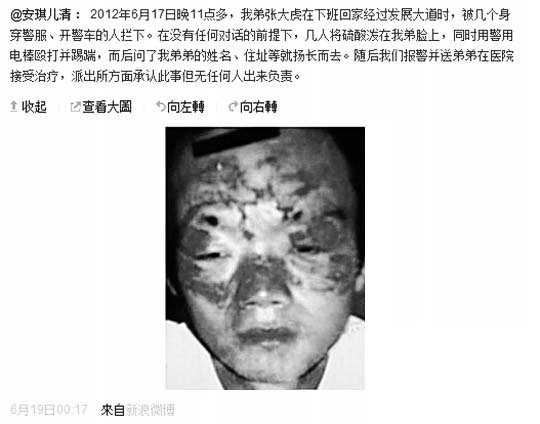 “2012年6月17日晚11点多,我弟张大虎在下班经过发展大道时,被几个身穿警服开警车的人拦下。在没有任何对话的前提下,几人将硫酸泼在我弟脸上,同时用警察电棒殴打并踢踹,而后问了我弟弟的姓名、住址等就扬长而去。随后我们报警并送弟弟在医院接受治疗,派出所方面承认此事但无任何人出来负责。”6月19日凌晨,网友“安琪儿清”的微博引起众多网友关注,目前已被转发了14000多次。