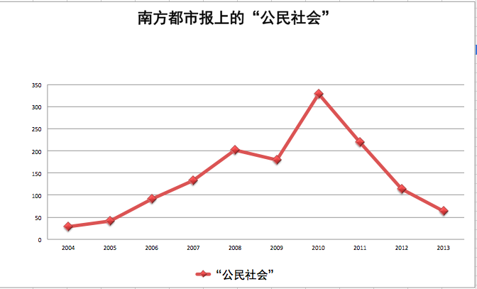 南方周末、南方都市报、新京报,曾是浅蓝话语活跃的平台,2013,浅蓝词语在这些报纸上骤减。以十年来南方都市报上的“公民社会”为例: