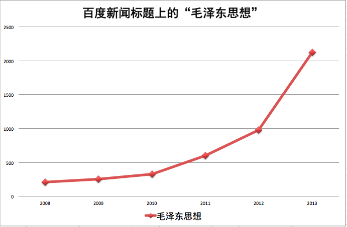 一,深红。继续观察“舆论斗争”一语。近期这一提法虽减少,但仍出现,人民日报最近一次使用是在12月30日。特别注意“高举毛泽东思想旗帜”的提法。中共近年规范的提法是“高举中国特色社会主义伟大旗帜”,但与江泽民纪念毛泽东诞辰百年、胡锦涛纪念毛诞辰110周年的讲话一样,习近平在120周年纪念时也提出“高举毛泽东思想旗帜”。这一提法是否会持续,须观察深红话语未来的表现。笔者曾指,“毛泽东思想”一语是中国政治的测量尺。查2013年人民日报和“慧科”数据库的中国内地报纸,“毛泽东思想”的频度未上升。但查百度新闻标题,2013年它达到6年来的最高峰(共计2120条,其中12月26日至12月31日312条):