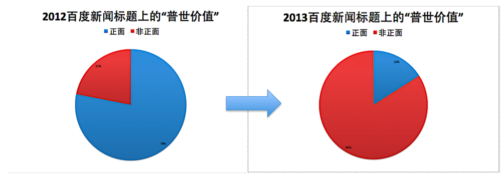 使用“百度新闻高级搜索”可见,2013与上一年判然不同。2012,标题含“普世价值”的约150篇,正面使用的占78%。标题含“宪政”的文章约400篇(剔除了与中国宪政无关者,下同), 全部正面使用“宪政”一词。2013,标题含“普世价值”的约500篇,非正面使用者占84%。含“宪政”的文章约1200篇,其中非正面使用“宪政”者占86%。