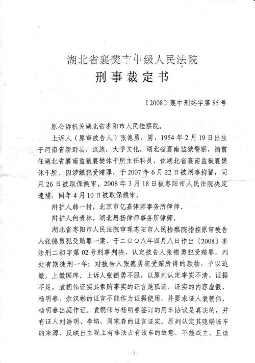 核心提示:2008年4月8日,湖北省襄南监狱一级警督张德勇被枣阳市法院判决受贿罪成立,并判处有期徒刑一年。张德勇警官不服一审判决,当庭向襄樊市中级法院提起上诉.2008年7月7日,人民监督网详细披露了该案黑幕——襄南监狱长熊自农为打击报复屡次挡住自己财路的政敌而勾结襄樊城郊检察院(原襄南监狱检察室)炮制冤假,作为交易条件襄樊城郊检察院得到了襄南监狱无偿提供建办公楼的水泥和红砖。2008年10月9日,襄樊市中级人民法院公开开庭审理了此案,10月15日合议庭以事实不清、证据不足、裁定发回一审法院重审,10月23日张德勇接到法院撤销原审判决裁定。