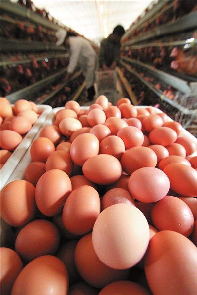 昨天,在山东省临沂市郯城县一家蛋鸡养殖场,工人在捡拾鸡蛋。据新华社全国农副产品和农资价格行情系统监测,4月中下旬以来,全国鸡蛋价格一改往年的平稳走势,出现小幅上涨。5月15日与4月18日相比,全国鸡蛋日均价涨幅为5.2%,与2010年5月15日每斤3.78元的价格相比,涨幅达23.8%。另据国家统计局数据显示,5月上旬涨价食物范围扩大,部分蔬菜重新涨价。新华社发