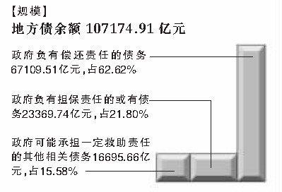 报告显示,到2010年底,除54个县级政府没有政府性债务外,全国省市县三级地方政府性债务余额共计107174.91亿元。数据显示,2010年,全国GDP总量39.8万亿元,全国财政收入8.3万亿元。