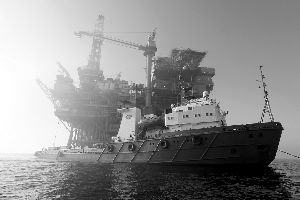 事发蓬莱19-3油田C平台旁,停泊着一艘打捞船。国家海洋局昨日确认,C平台仍有少量油花溢出,B平台附近海域仍可能发生溢油。本报记者 崔木杨 摄
