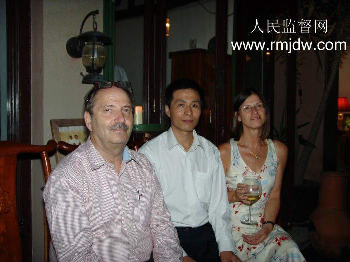 德国驻华大使馆新闻处官员亨克尔博士(右)、德国《世界报》记者 约尼.艾林(左)与人民监督网记者朱瑞峰合影