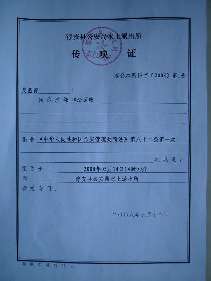 2008年5月11日、12日、13日淳安县公安局水上派出所部分警察,分别对依法建议罢免的部分民众被带往派出所。