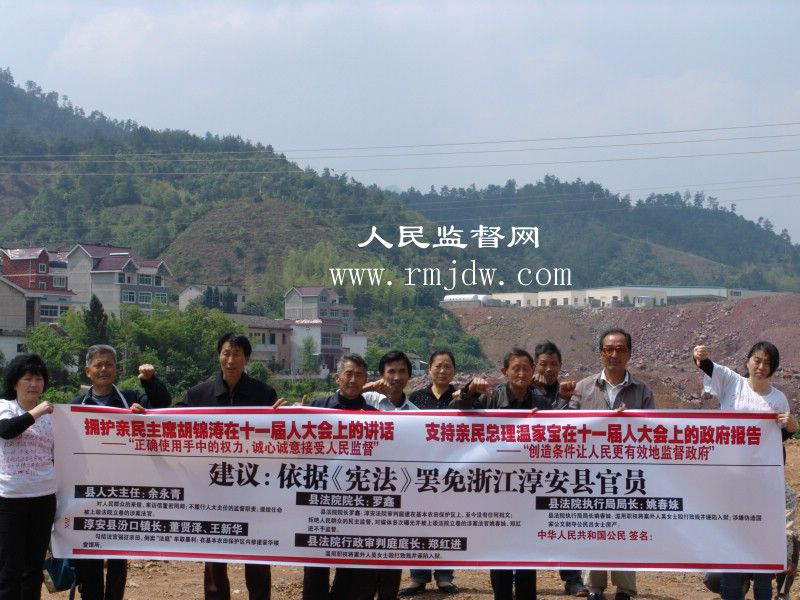 2008年5月10日,浙江省淳安县千岛湖风景区旅游码头,众位公民打着横幅:“拥护亲民主席胡锦涛在十一届人大会上的讲话,——“正确使用手中的权力,诚心诚意接受人民监督”。支持亲民总理温家宝在十一届人大会上的政府报告,——“创造条件让人民更有效地监督政府”。依据《宪法》罢免浙江淳安县官员—— 县人大主任余永青;淳安县汾口镇长董贤泽、王新华;县法院院长罗鑫;县法院执行局局长姚春妹;县法院行政审判庭庭长郑红进。