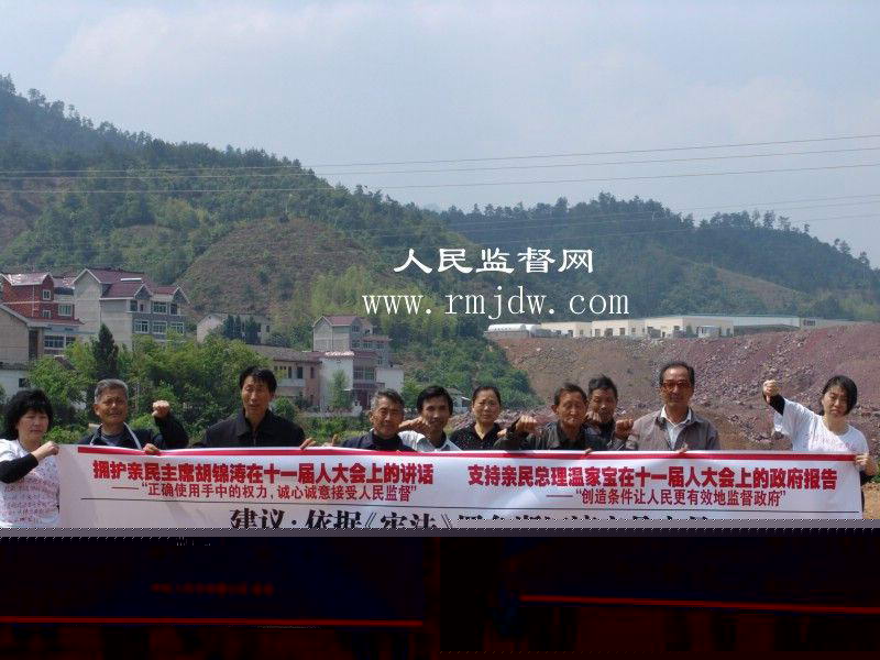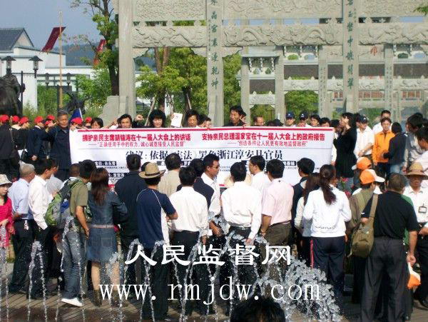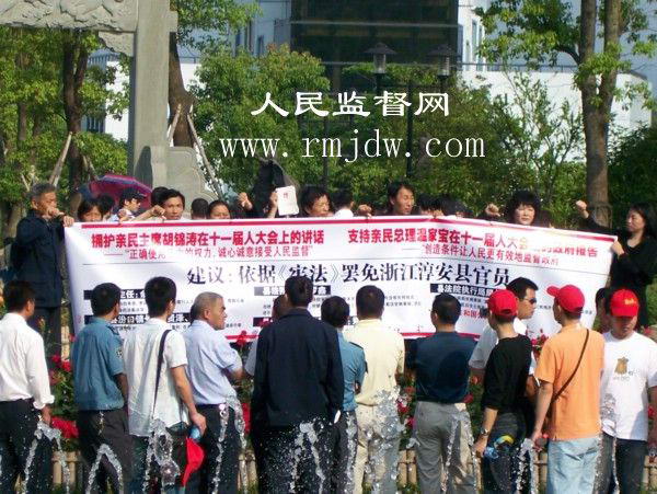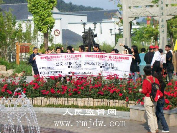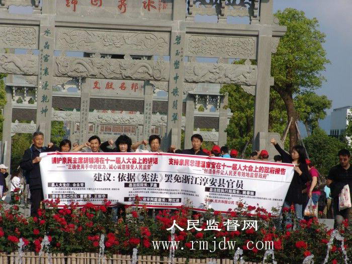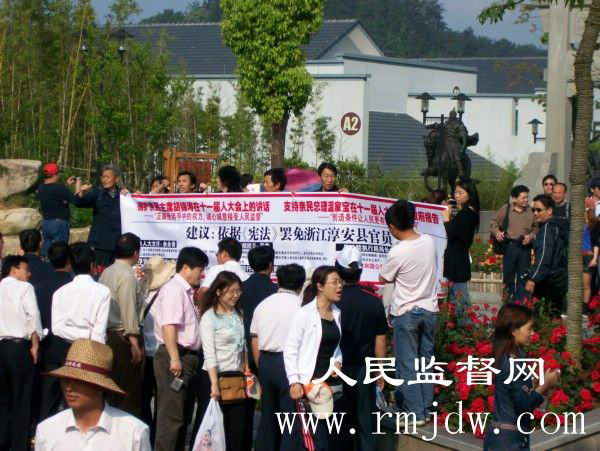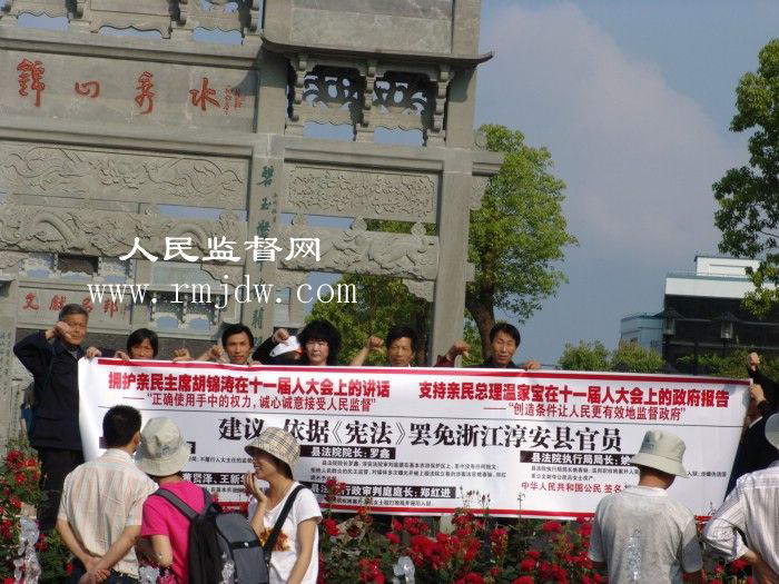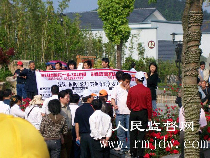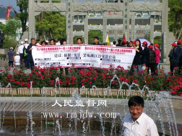 2008年5月10日,浙江省淳安县千岛湖风景区旅游码头,众位公民打着横幅:“拥护亲民主席胡锦涛在十一届人大会上的讲话,——“正确使用手中的权力,诚心诚意接受人民监督”。支持亲民总理温家宝在十一届人大会上的政府报告,——“创造条件让人民更有效地监督政府”。依据《宪法》罢免浙江淳安县官员—— 县人大主任余永青;淳安县汾口镇长董贤泽、王新华;县法院院长罗鑫;县法院执行局局长姚春妹;县法院行政审判庭庭长郑红进。