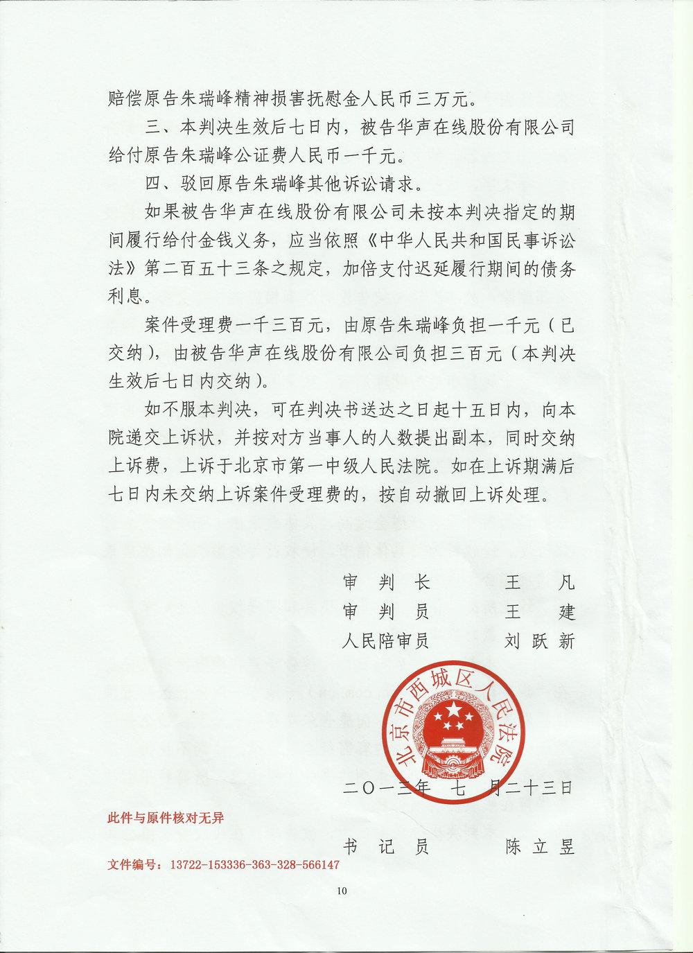 北京市西城区最终做出的判决为:7日内,在侵权言论主要出现的“华声论坛—地方—河南社区”板块,连续30日置顶刊登赔礼道歉公告,逾期不执行,法院将在相关媒体上刊登判决书主要内容。同时,由华声在线股份有限公司赔偿朱瑞峰精神损害抚慰金3万元(1元人民币约合0.16美元)。