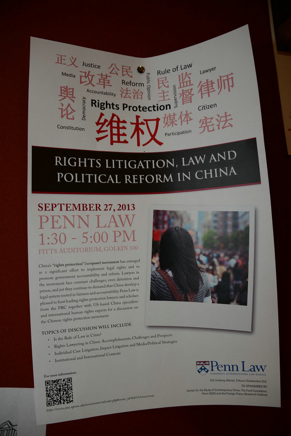 【人民监督网讯 记者范光涛 美国费城报道】2013年9月26日——27日,人民监督网记者朱瑞峰应美国宾夕法尼亚大学法学院邀请,参加由宾夕法尼亚大学主办的《中国的维权诉讼,法律与政治改革》研讨会。