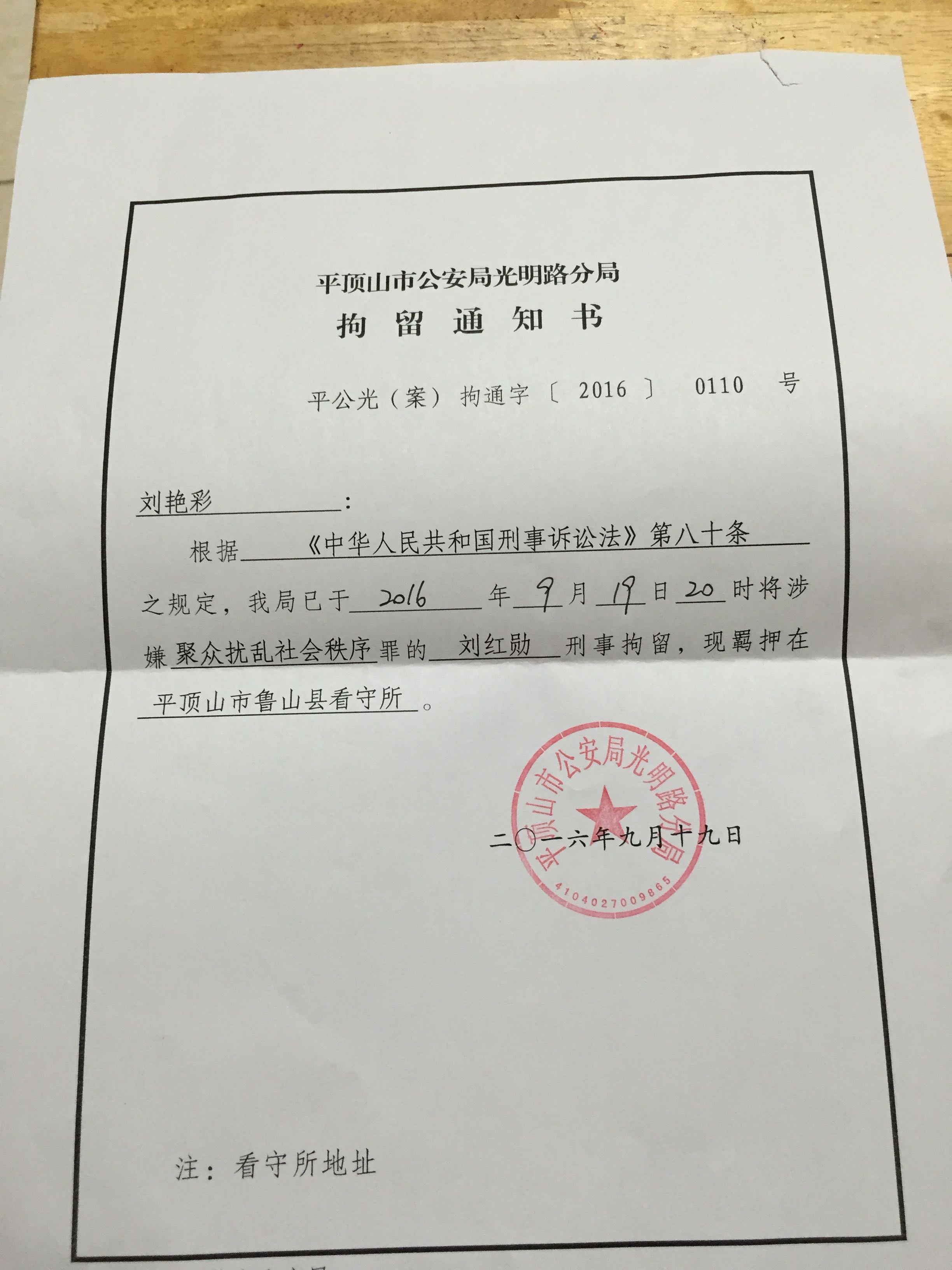 刘红勋的妻子刘女士接受人民监督网记者采访时说,9月18日中午,光明路派出所四名人员突然来到我家,将刘红勋带走,并且未出示任何手续。21日,我们家人得知刘红勋已被光明路公安分局以“聚众扰乱社会秩序罪”为由刑事拘留。