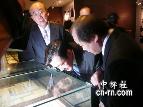 马英九专心听解说,仔细看史料。