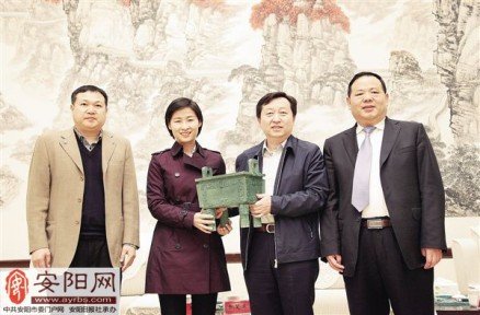 4月3日,安阳市委书记张笑东向刘洋赠送纪念品(安阳日报)