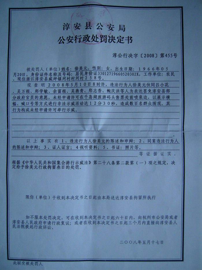 2008年5月10日,浙江省淳安县千岛湖风景区旅游码头,众位公民打着横幅:“拥护亲民主席胡锦涛在十一届人大会上的讲话,——“正确使用手中的权力,诚心诚意接受人民监督”。支持亲民总理温家宝在十一届人大会上的政府报告,——“创造条件让人民更有效地监督政府”。依据《宪法》罢免浙江淳安县官员—— 县人大主任余永青;淳安县汾口镇长董贤泽、王新华;县法院院长罗鑫;县法院执行局局长姚春妹;县法院行政审判庭庭长郑红进。