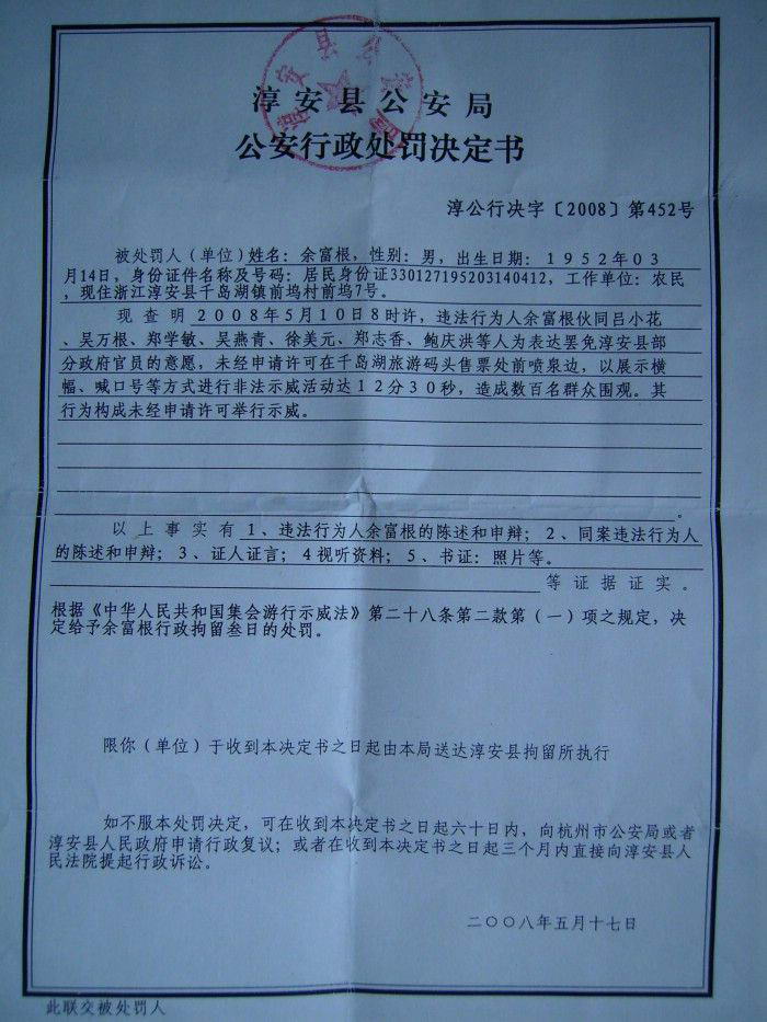2008年5月17日,依法建议罢免官员的民众余富根、吴万根、郑学敏、吴燕青、吕小花、徐美元被淳安县公安局行政拘留3天。
